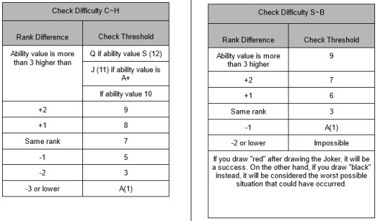 1. Compare the "difficulty level" of the task that the group selected and the "ability value" of the chosen character, and compare them to the table (Note: The table to be compared is different depending on the Check Difficulty.)