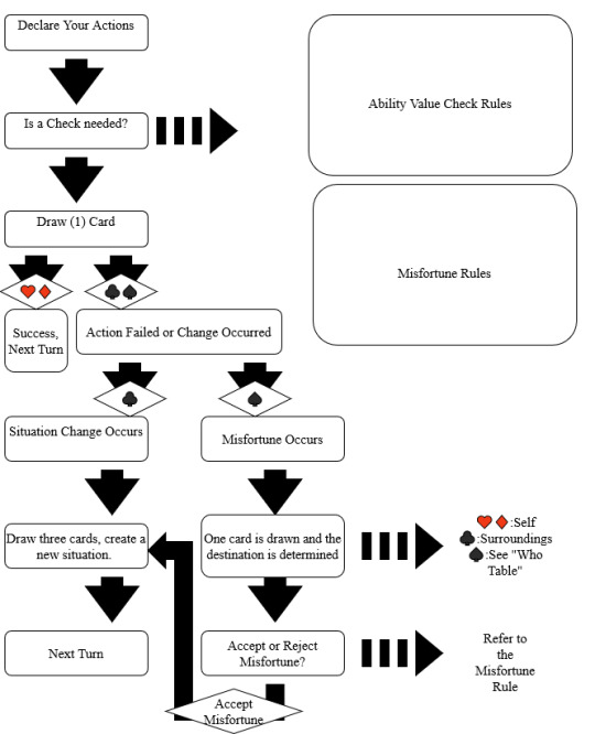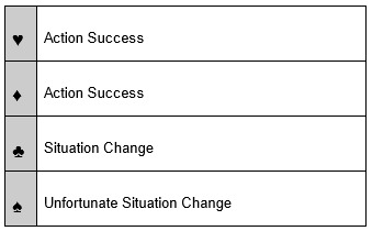 After you have declared a character action and after deciding whether a check is needed, draw a card. This card will determine the outcome of the desired action. If a red card (Hearts or Diamonds) the action is allowed to happen unchanged. If a black card (Clubs or Spades) the action is changed. If its a Spade, its an unfortunate change.