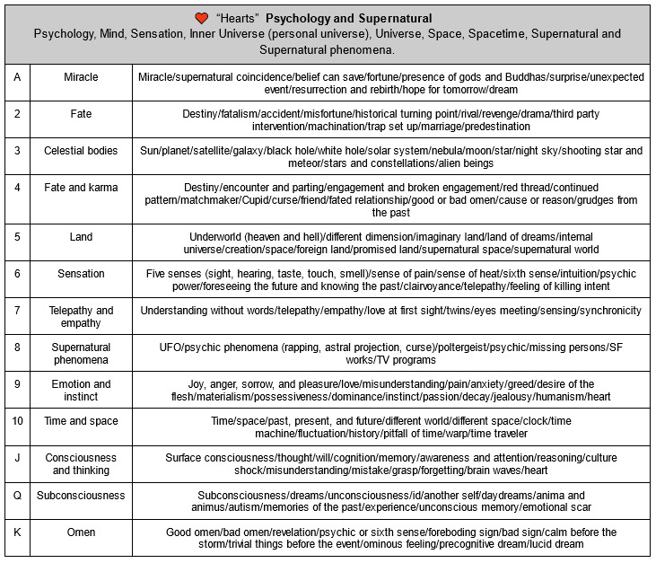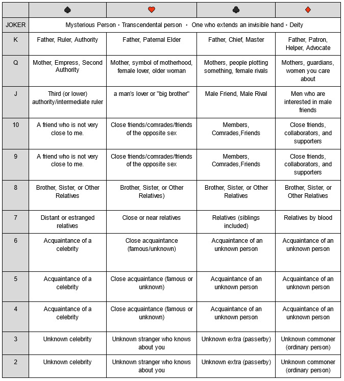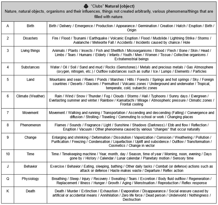 Changes are determined by drawing 3 cards and creating a scenario using the keywords from the selected cards, referencing the charts below. These changed scenarios will happen in place of the declared action. If you encounter a Joker, keep drawing 3 cards until no Jokers appear.